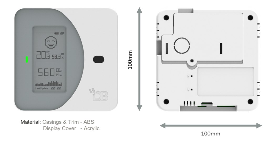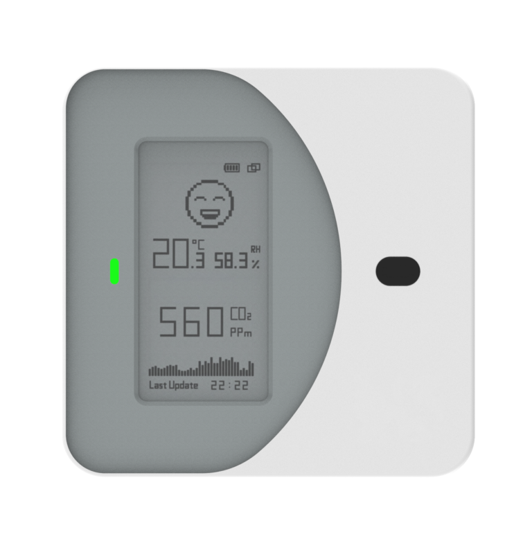 The white and grey color palette is chosen to ensure the design feels minimalistic and modern. White signifies cleanliness and purity, reflecting the sensor’s purpose of monitoring and ensuring healthy air quality. Grey complements the E Ink display, allowing the display to blend seamlessly with the device’s overall design. This combination ensures that the sensor not only enhances the aesthetic appeal of any environment but also maintains a cohesive, unobtrusive presence in both home and office settings.